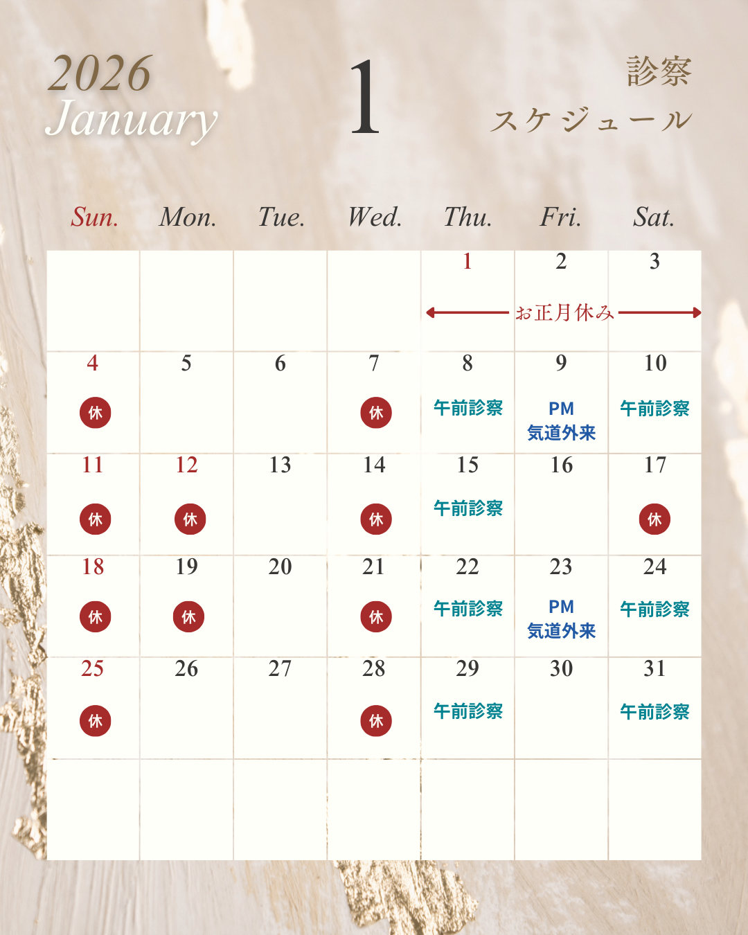 あけましておめでとうございます。1月の診察日です。
