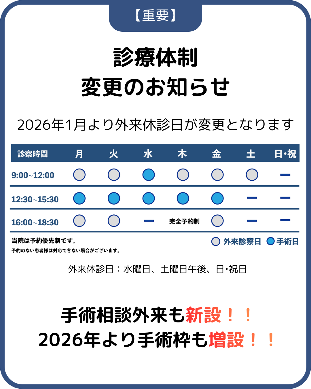 本年より外来休診日が水曜日に変更となります。お間違えないよう、よろしくお願いいたします。